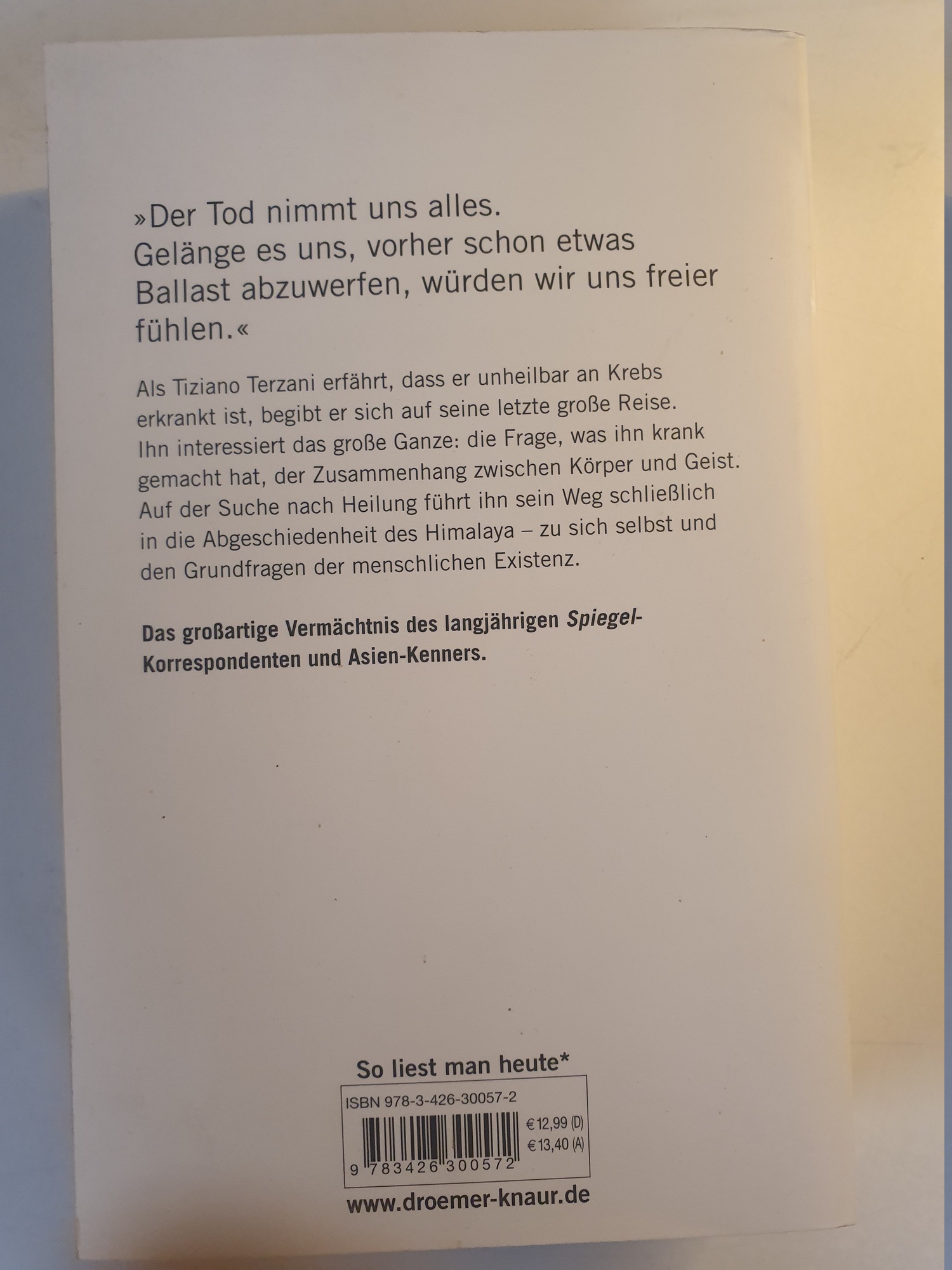 In diesem tiefgründigen Werk setzt sich der bekannte Journalist Tiziano Terzani mit seiner Krebsdiagnose auseinander. Er begibt sich auf eine letzte grosse Reise durch Asien und Amerika, um nach alternativen Heilmethoden und spirituellen Antworten zu suchen. Das Buch ist ein bewegendes Zeugnis über die Suche nach dem Sinn des Lebens angesichts des Todes. Terzani beschreibt seinen Weg von der westlichen Medizin hin zu einer inneren Gelassenheit und Weisheit.