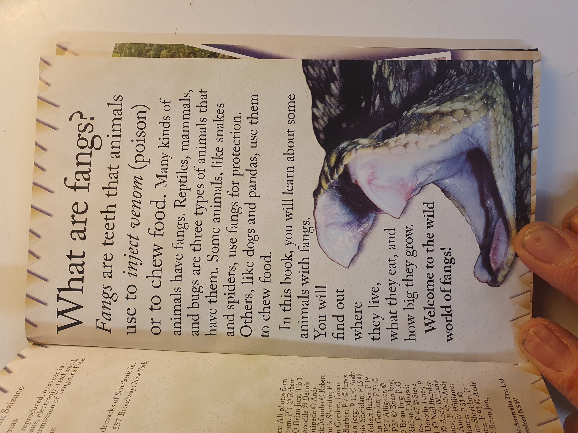 ""Fangs!"" ist ein packendes Sachbuch für junge Entdecker, das die beeindruckendsten Gebisse und Fangzähne der Tierwelt vorstellt. Von giftigen Spinnen bis hin zu majestätischen Raubkatzen bietet das Buch spannende Einblicke in die Anatomie und das Jagdverhalten gefährlicher Kreaturen. Mit grossartigen